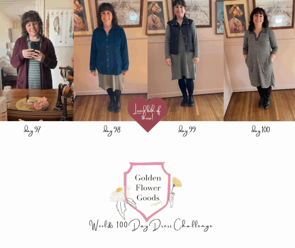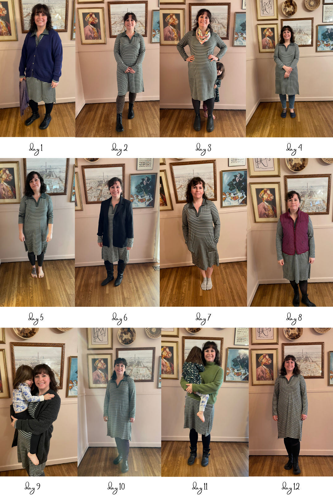 Coming into the fall last year, I decided that one of my goals is to curate my closet and make some updates so it better reflects my style, fabric preferences, and color profile. To that end, I had been reading through my copy of The Curated Closet and researching some ideas on Pinterest. From there, I came across an ad for the Wool& 100 Day Dress Challenge. I had mentioned it to my husband in passing, and then I came across it again at Christmastime. My husband had a gift card and said, “I’m going to order you a dress for that challenge.” He’s an activator. 🙂 So I picked out the Bristol Dress in the color Thyme. It is a sage green with ivory stripes. I knew I didn’t want to use a black dress because I have been trying to step outside of black. I also liked that it was a different style of dress than my typical shift dress, and I thought it would layer decently well.