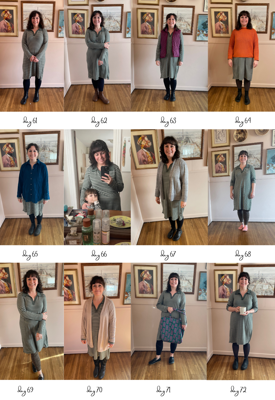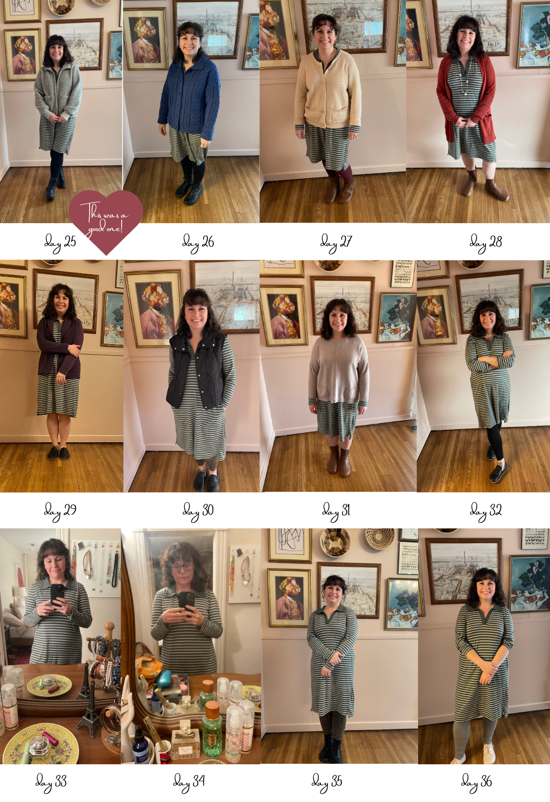 Will I continue to wear the Bristol dress after this challenge? Yes! Although it isn’t my most favorite style ever, I do like it, and it is a nice change of pace. I think it is a great addition to my wardrobe—it is comfortable; I like the color and the stripes. I also really like the weight of the wool for this dress. It doesn’t feel heavy, but it is warm. It is not see through, and even though it is long sleeved, it layered very nicely under other sweaters.