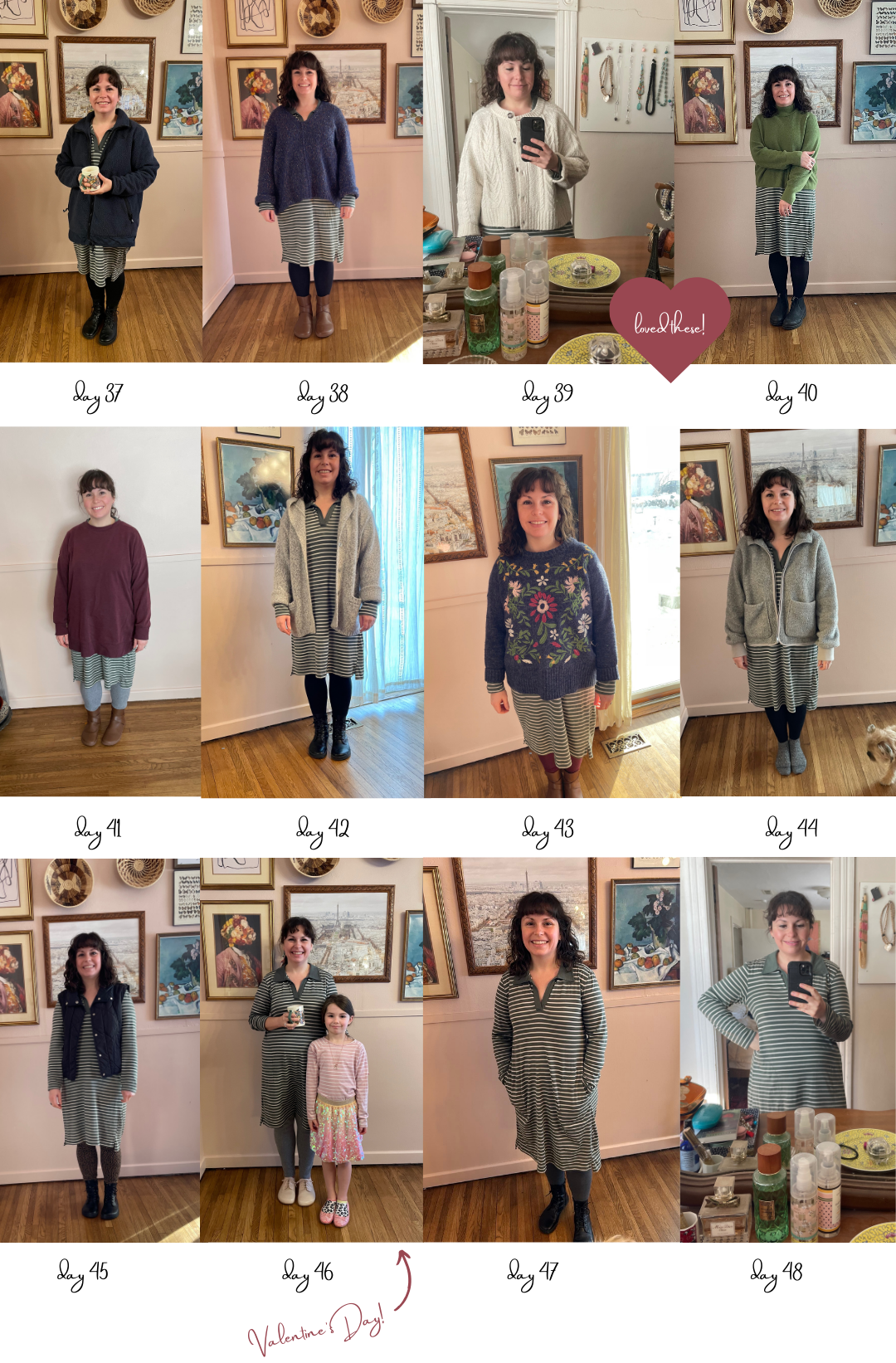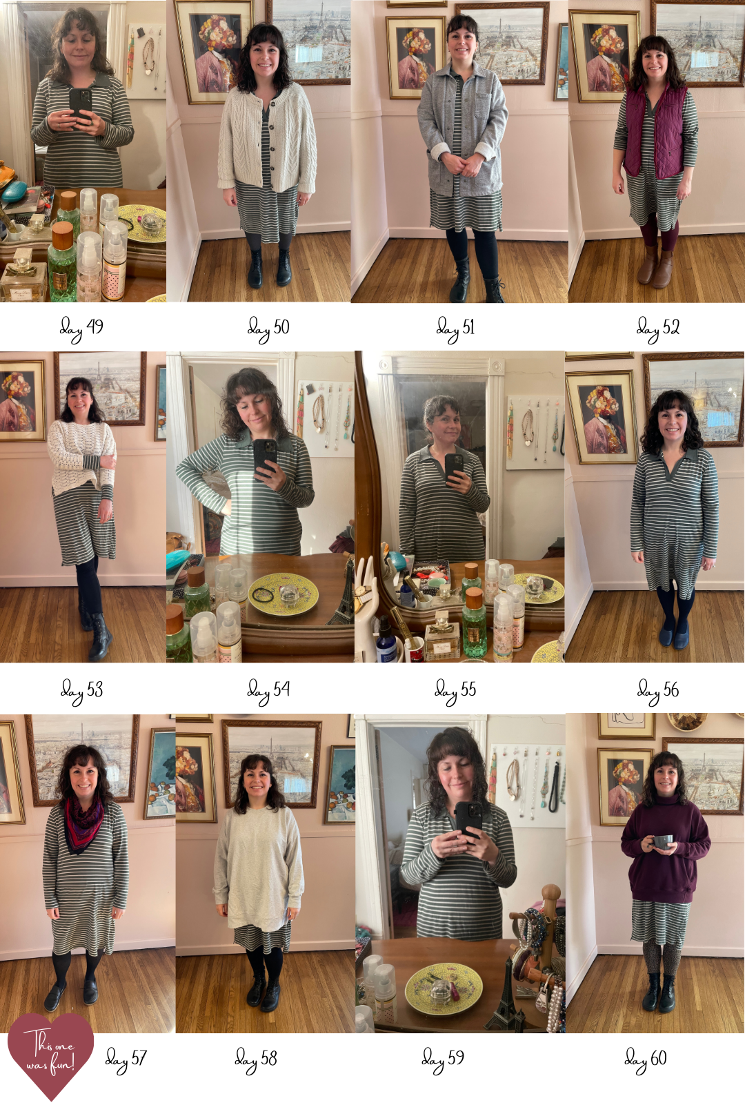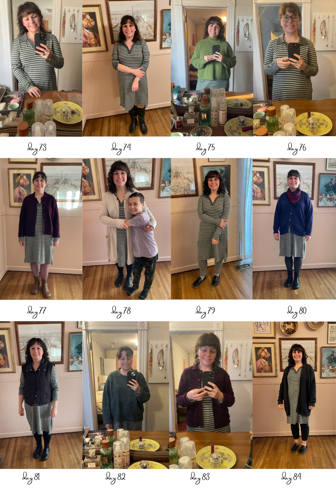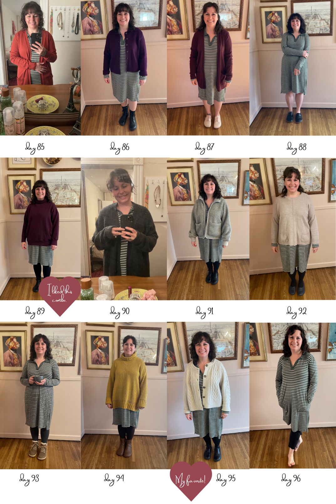 The first few days were easy. I was feeling good about the challenge, and my desire to ‘conquer’ the challenge was definitely high. I did encounter a couple of frustrations right away, though. First, I had a whole drawer of tights, but I realized that only a couple of pairs fit comfortably or worked well for my needs. It was winter, and I had to have leggings or tights to stay warm. I ended up ordering a pair of navy blue cotton tights from Amazon as well as buying a pair of light gray cashmere leggings from Poshmark. (Later in the challenge I also added a thinner pair of brown leggings, which have been a nice addition.)
